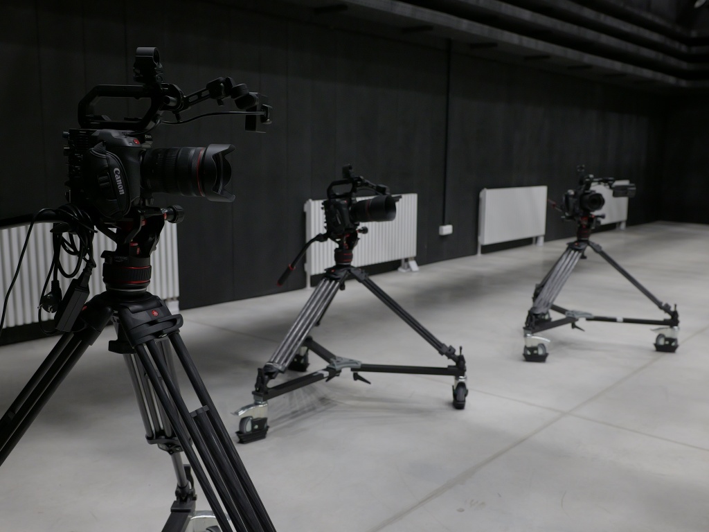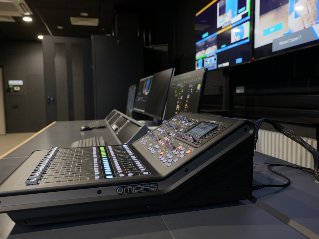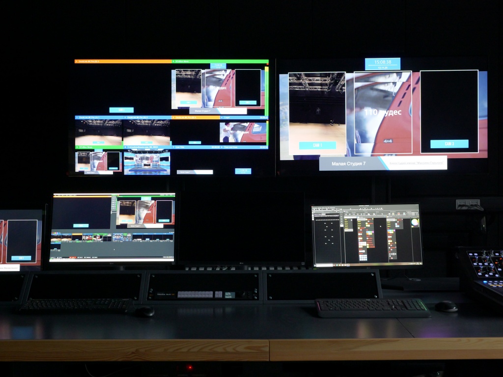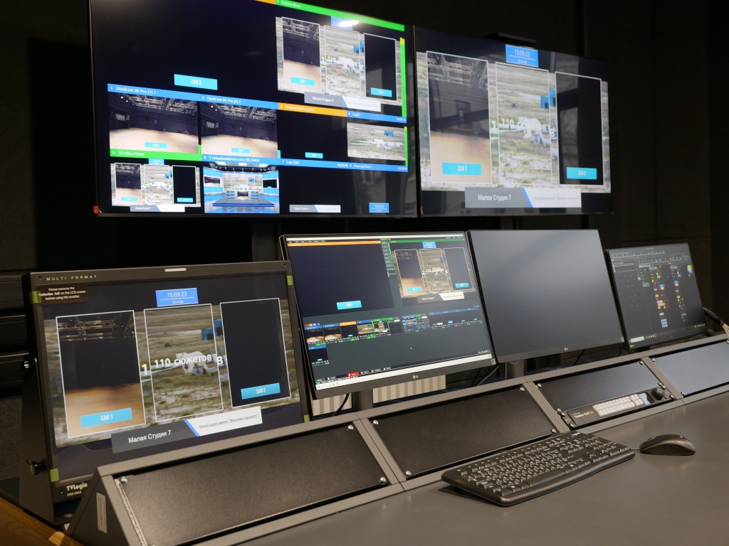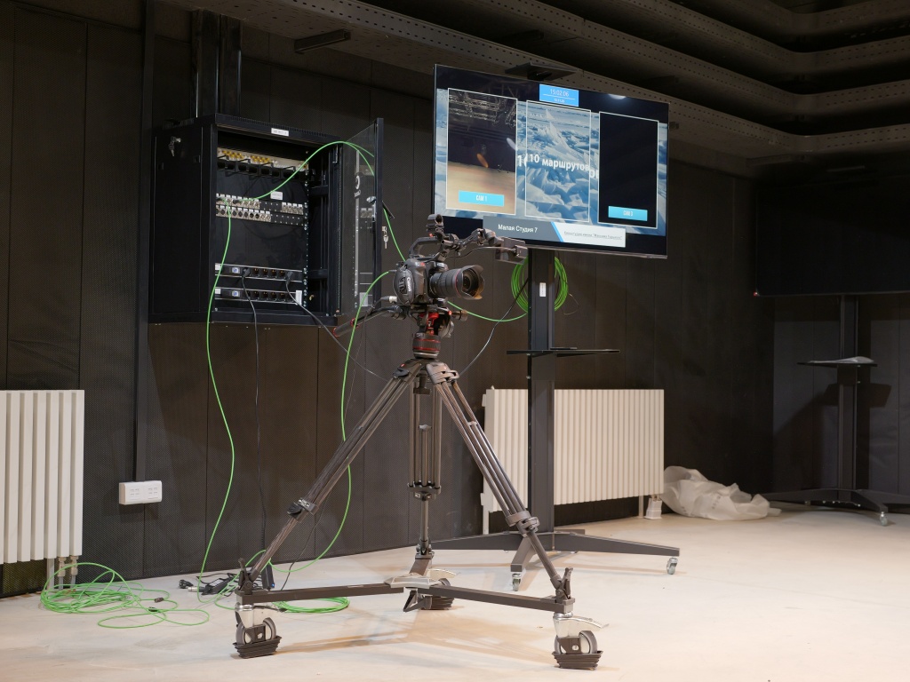 Многокамерную съемку в каждой студии обеспечивают по три видеокамеры со съемной кинооптикой. В каждом АСБ установлены программный видеомикшер, аудиомикшер и коммутационно-распределительное оборудование.