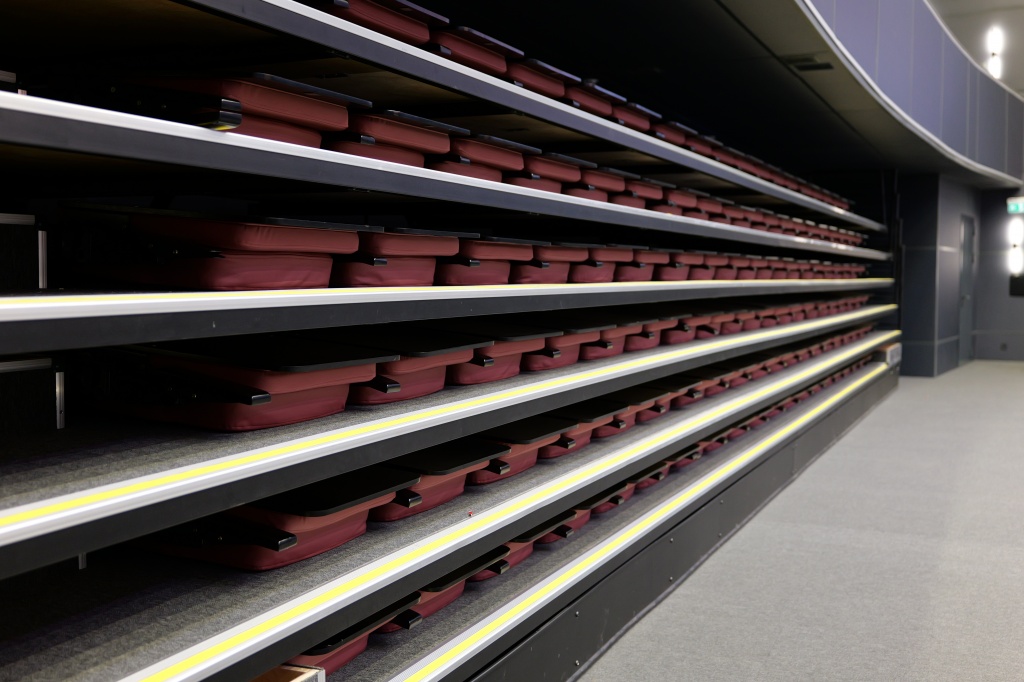Для кинопросмотра установлен экран 15х8 метров с механизированным занавесом. Система кашетирования позволяет менять соотношение сторон кадра на экране в зависимости от формата фильма: механизированная система лебедок и ткани настраивает видимую область полотна экрана под нужный размер и коррелирует ее с проектором и с демонстрируемым контентом.