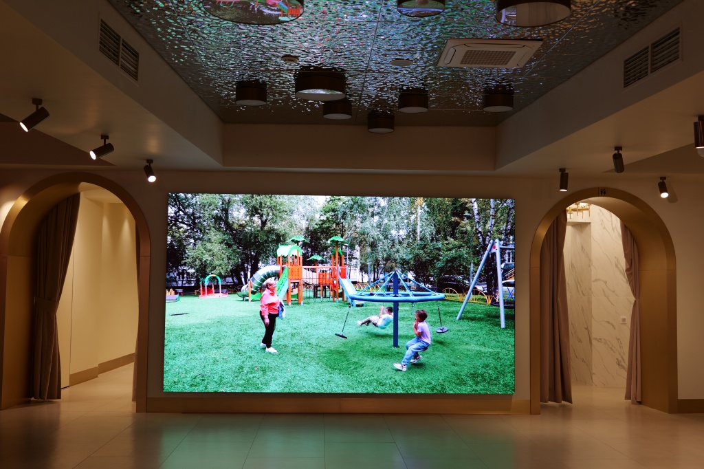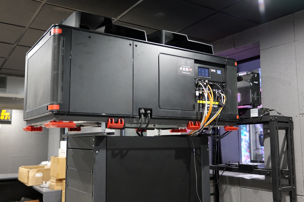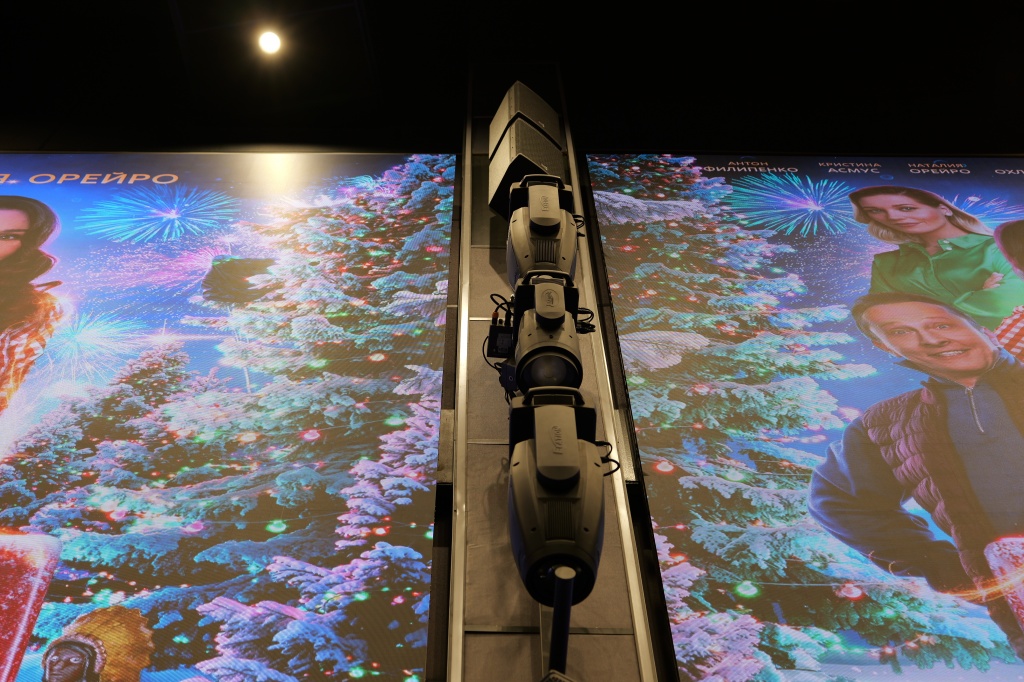 Центральным узлом кинозала является лазерный проектор Barco премиум-класса с уровнем яркости 35 000 лм. Реалистичный иммерсивный звук с конфигураций динамиков 26.1.2, трехслойным объемным звучанием и дополнительными зонами в помещении обеспечивает процессор пространственного звука Barco APX Auromax нового поколения.