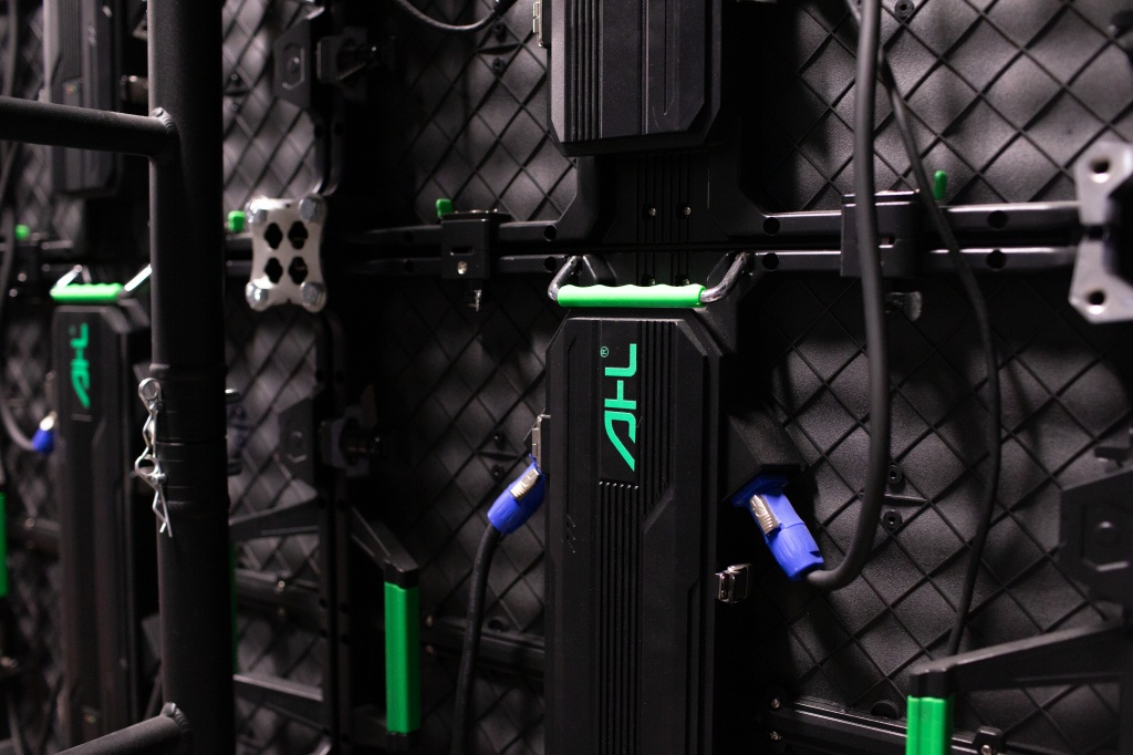 Кроме того, зал оборудован двумя светодиодными экранами большой площади (7,5х2,9 м и 2,3х2,9 м) с возможностью извлекать с лицевой стороны экрана LED-кабинеты для их сервисного обслуживания и замены. Эти экраны можно использовать как часть декорационного оформления зала.