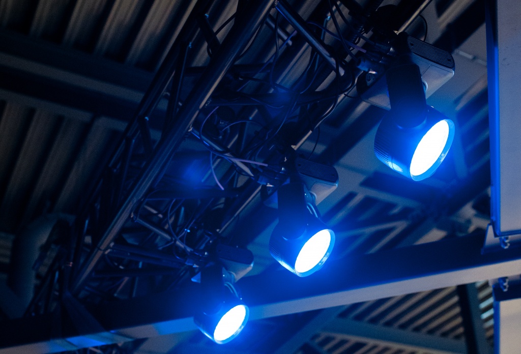 Система спецосвещения обеспечивает полноцветную заливку сцены с помощью 18 светодиодных светильников – прожекторов и «вращающихся голов», установленных на четырех квадратных фермах с моторизованными элементами управления, позволяющими опускать ферму для обслуживания и корректировки.