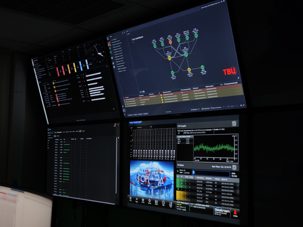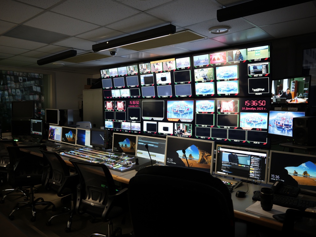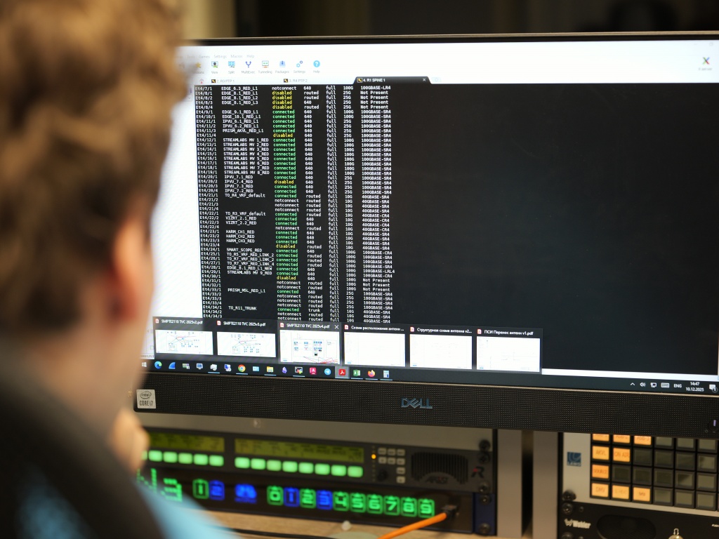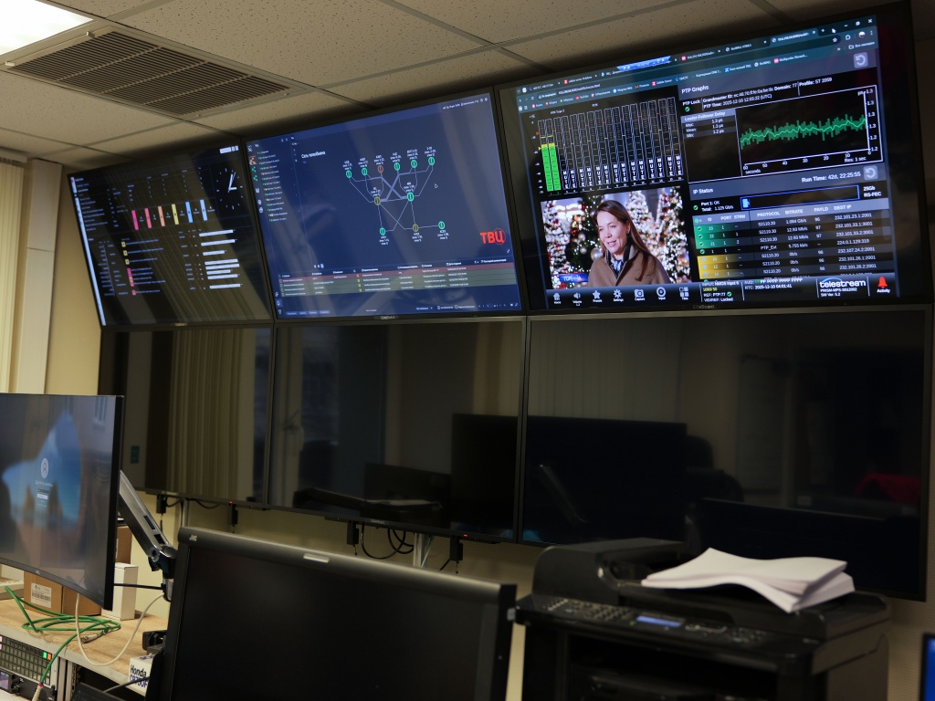 Установлена центральная матрица коммутации по топологии Leaf-Spine (4+4), благодаря чему в студии ТВЦ построена распределенная сеть. Внедрена система оркестрации и управления центральной матрицей, включая панели управления на рабочих местах. Интегрированы системы преобразования, мониторинга и инструментального контроля видео- и аудиосигналов